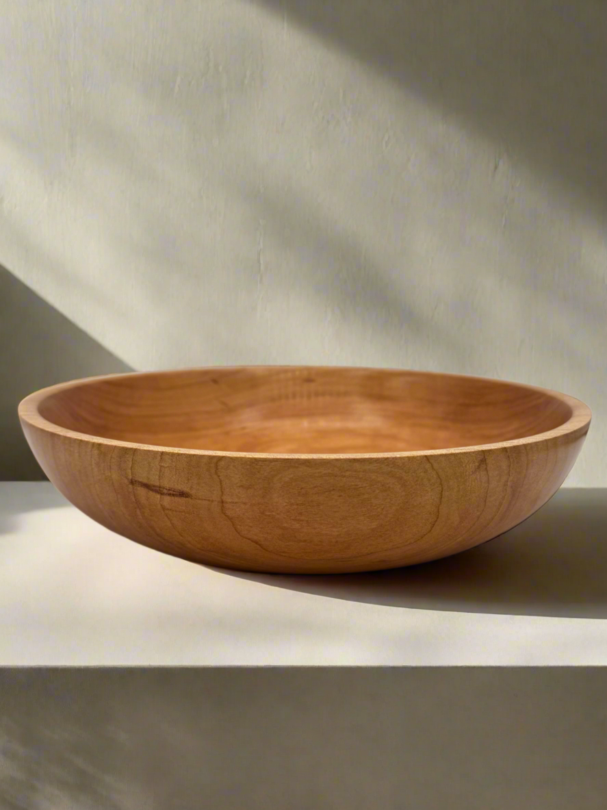 Hand turned Cherry wood bowl, measuring at 10.15 inches wide and 2.25 inches tall, finished with General Finishes “Wood Bowl Finish”.