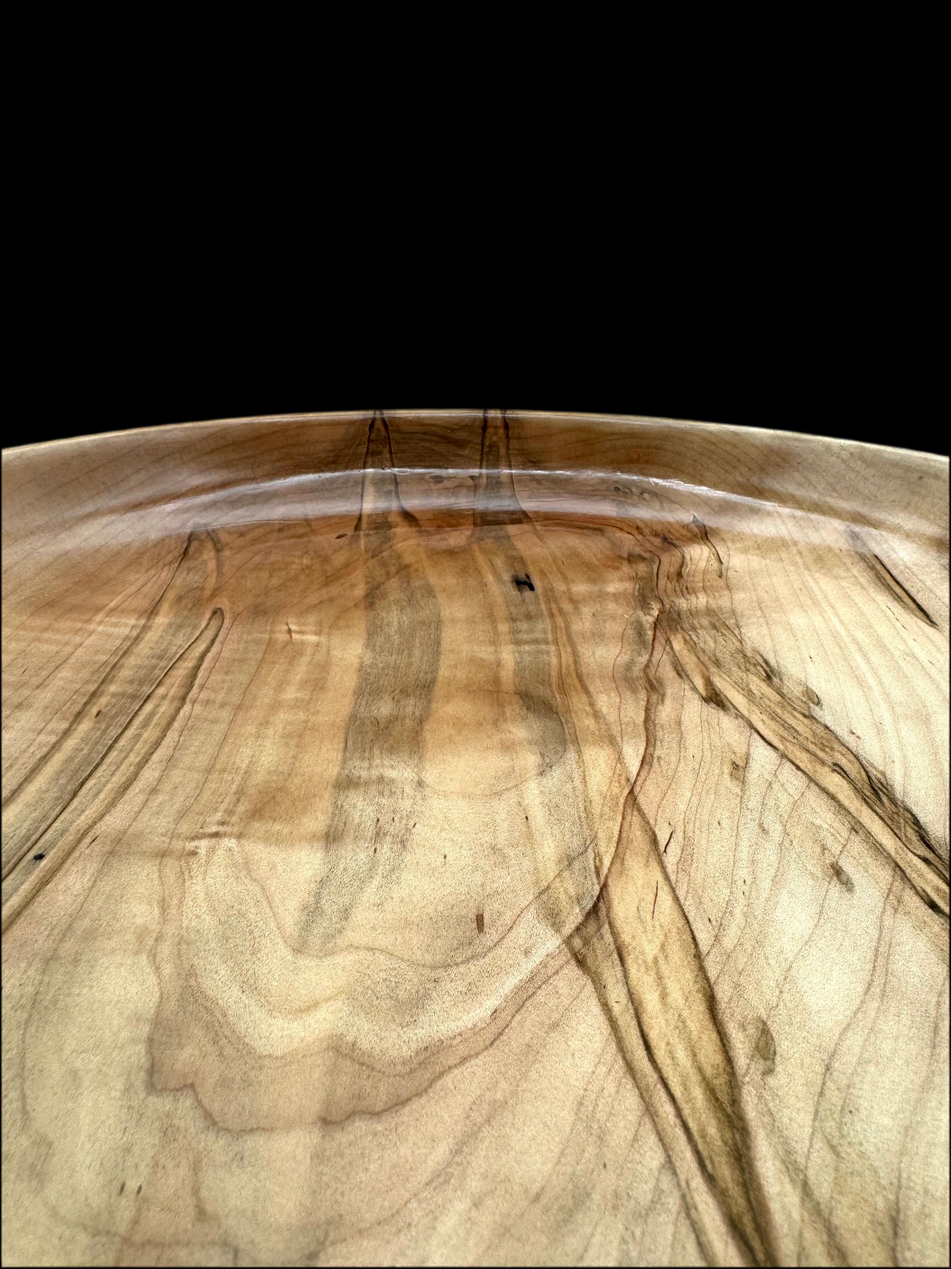 Hand- turned Ambrosia Maple wood platter, measuring 14.6 inches wide and 2.25 inches tall. Finished with General Finishes “ Wood Bowl Finish”.