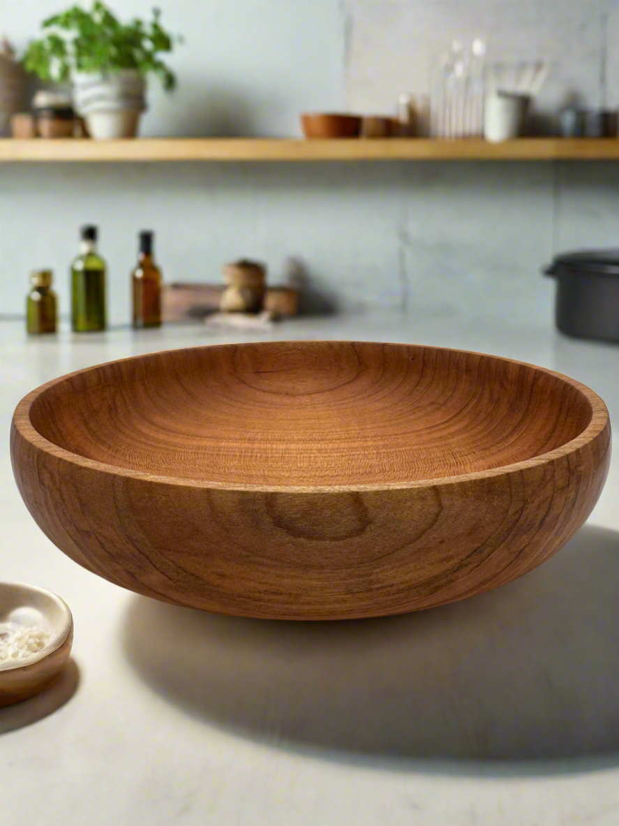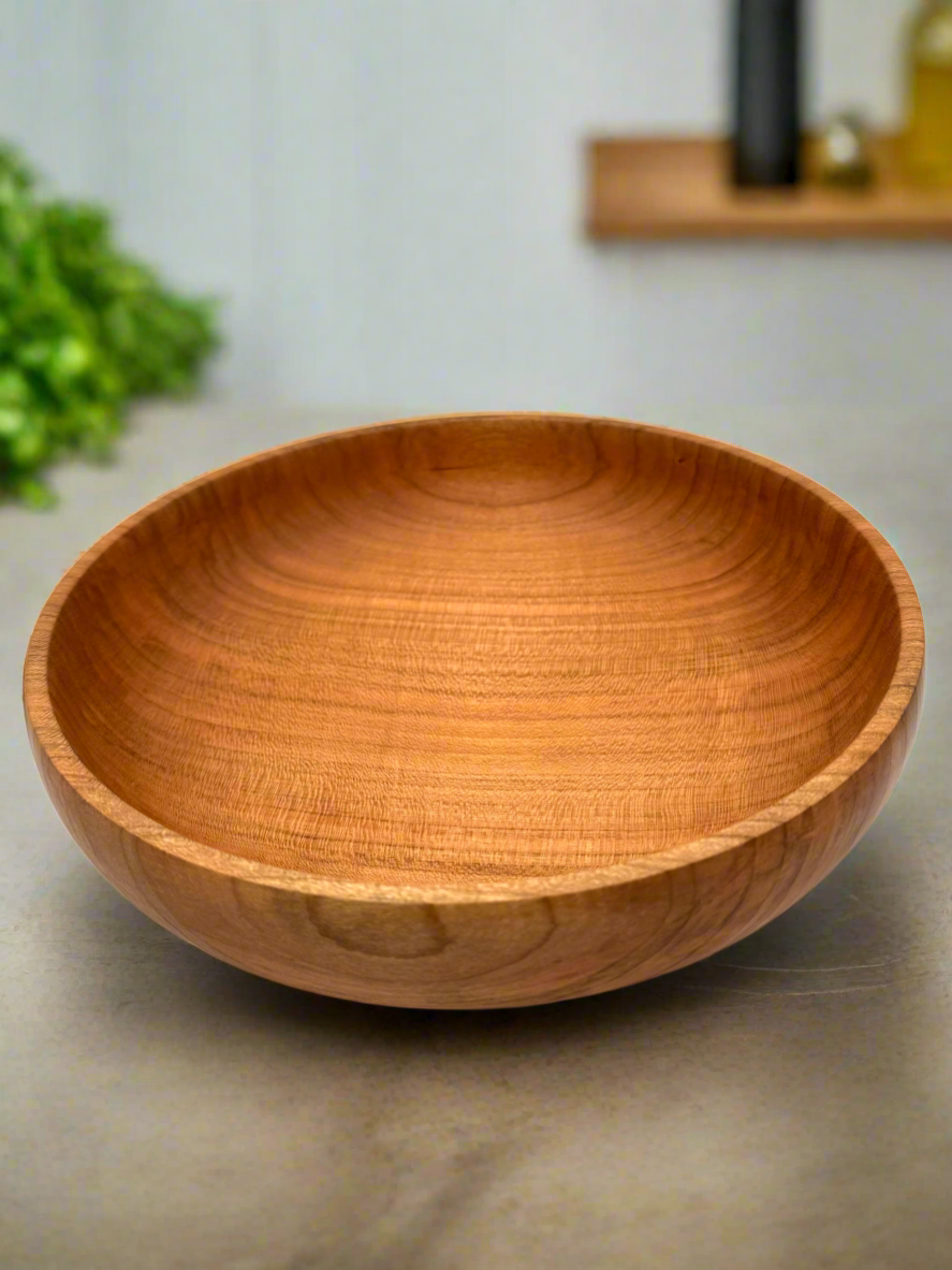 Hand-turned Cherry wood platter, 9.5 inches wide and 2.25 inches tall. Finished in linseed oil and beeswax.