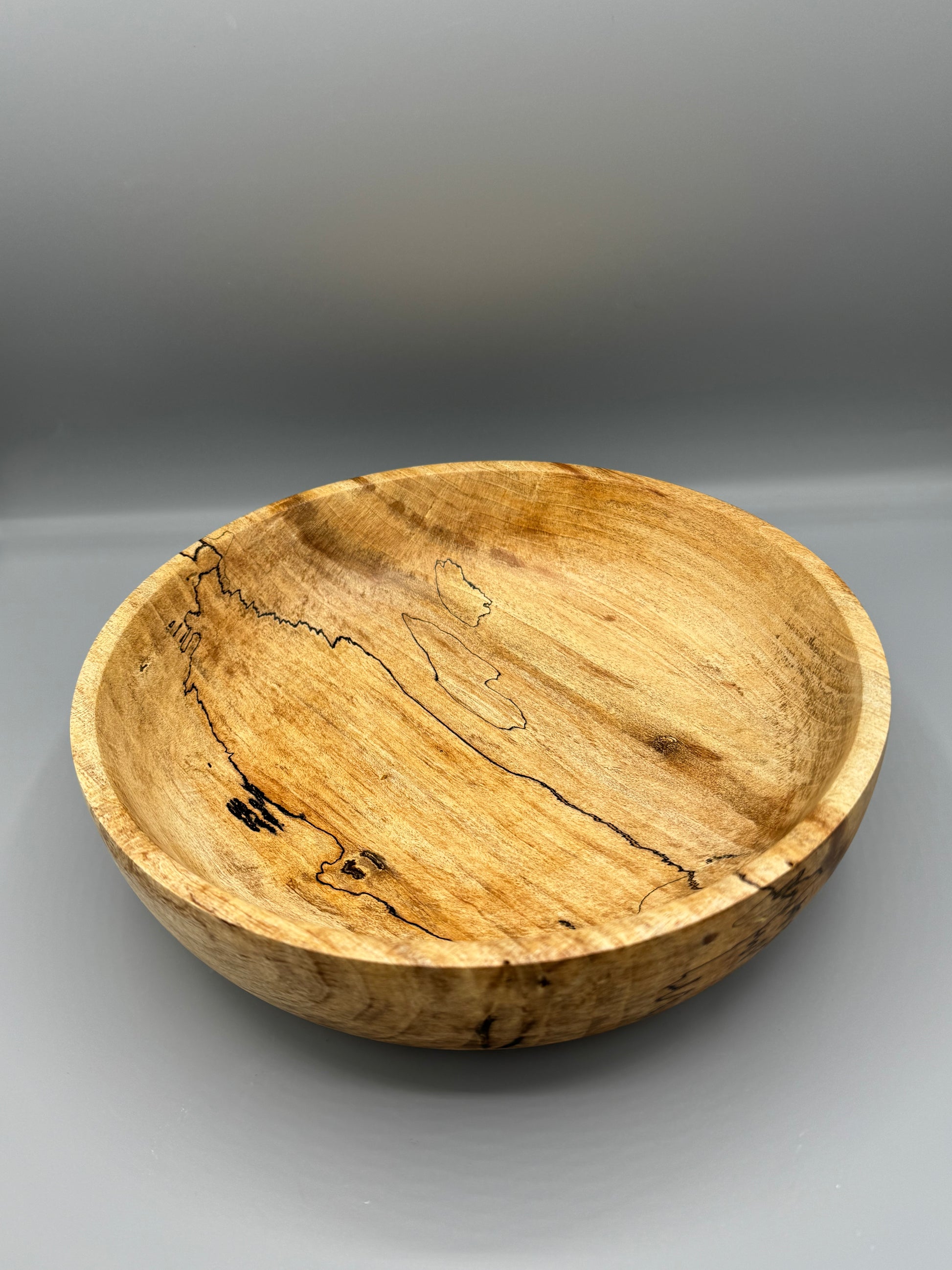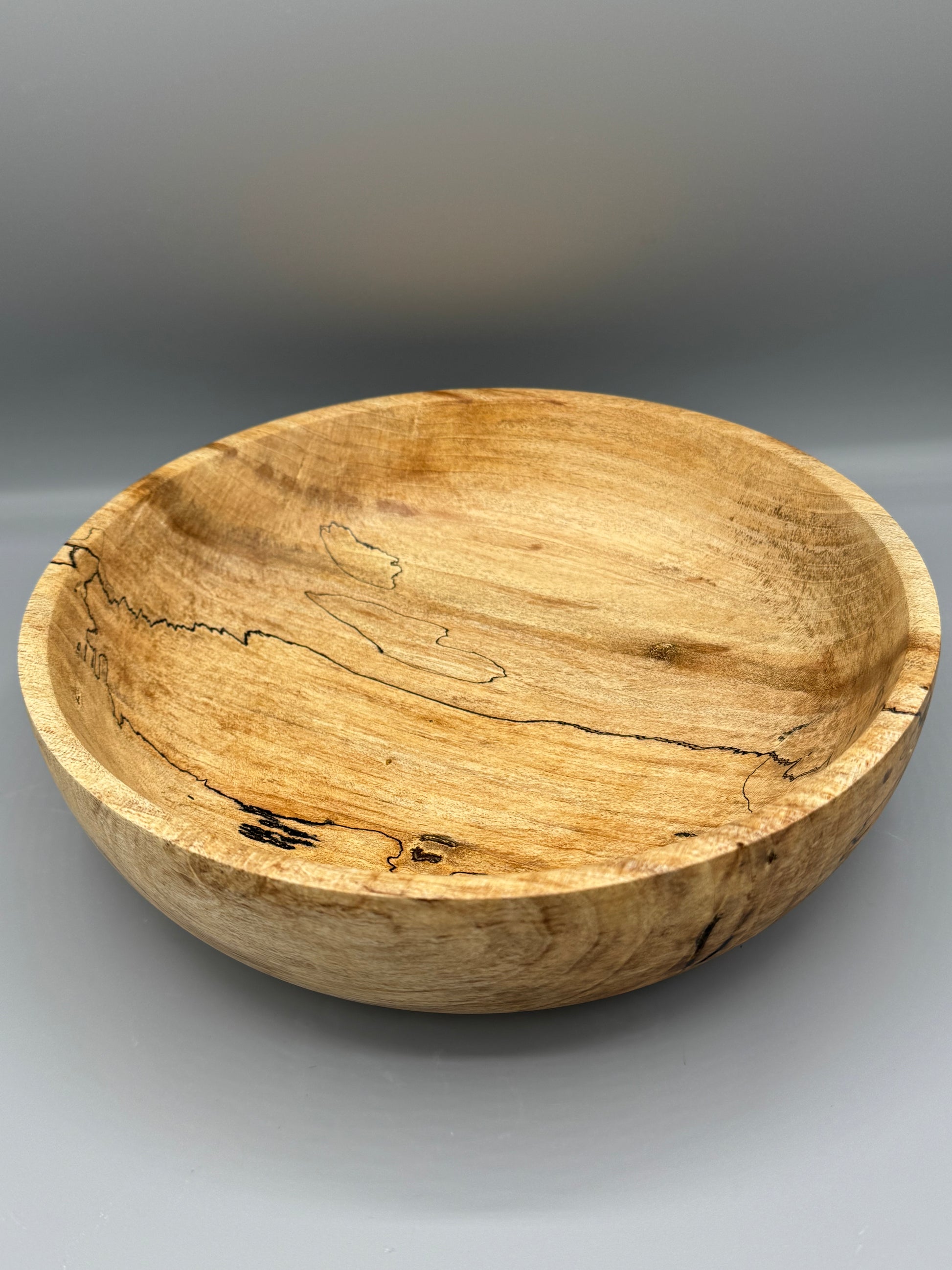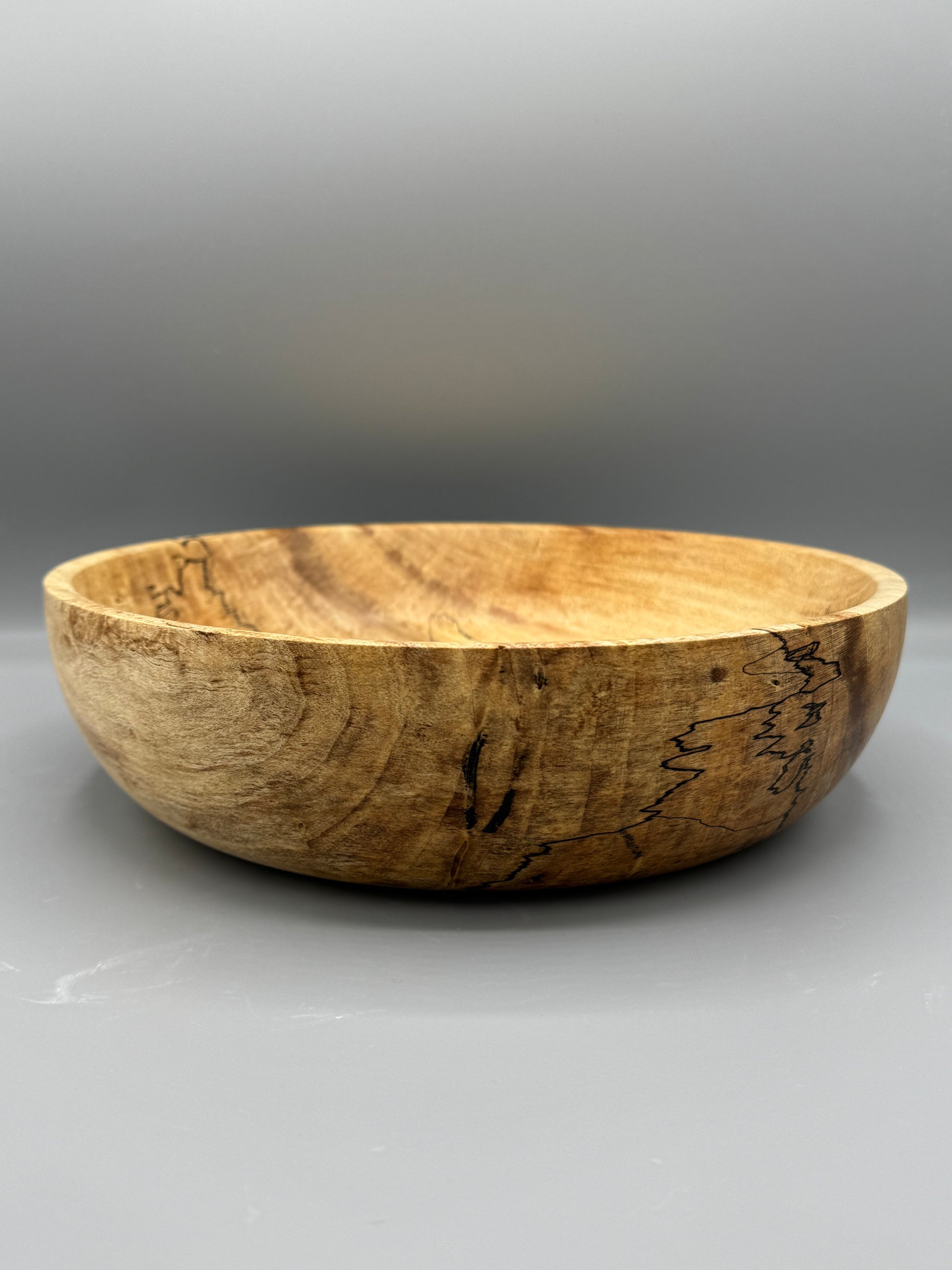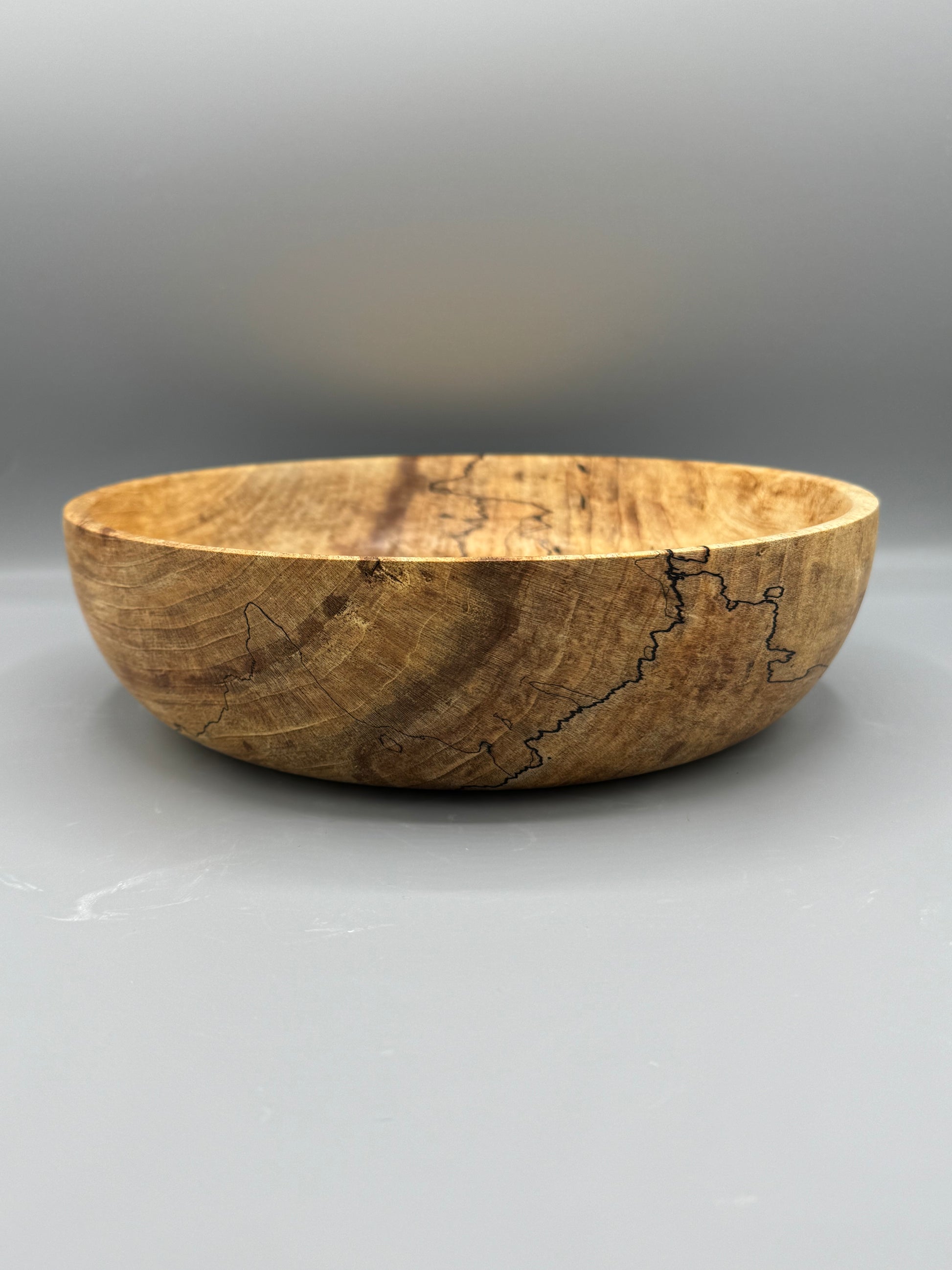 Hand-turned Spalted Maple wood bowl, 9.75 inches wide and 2.75 inches tall. Finished with linseed oil and beeswax.