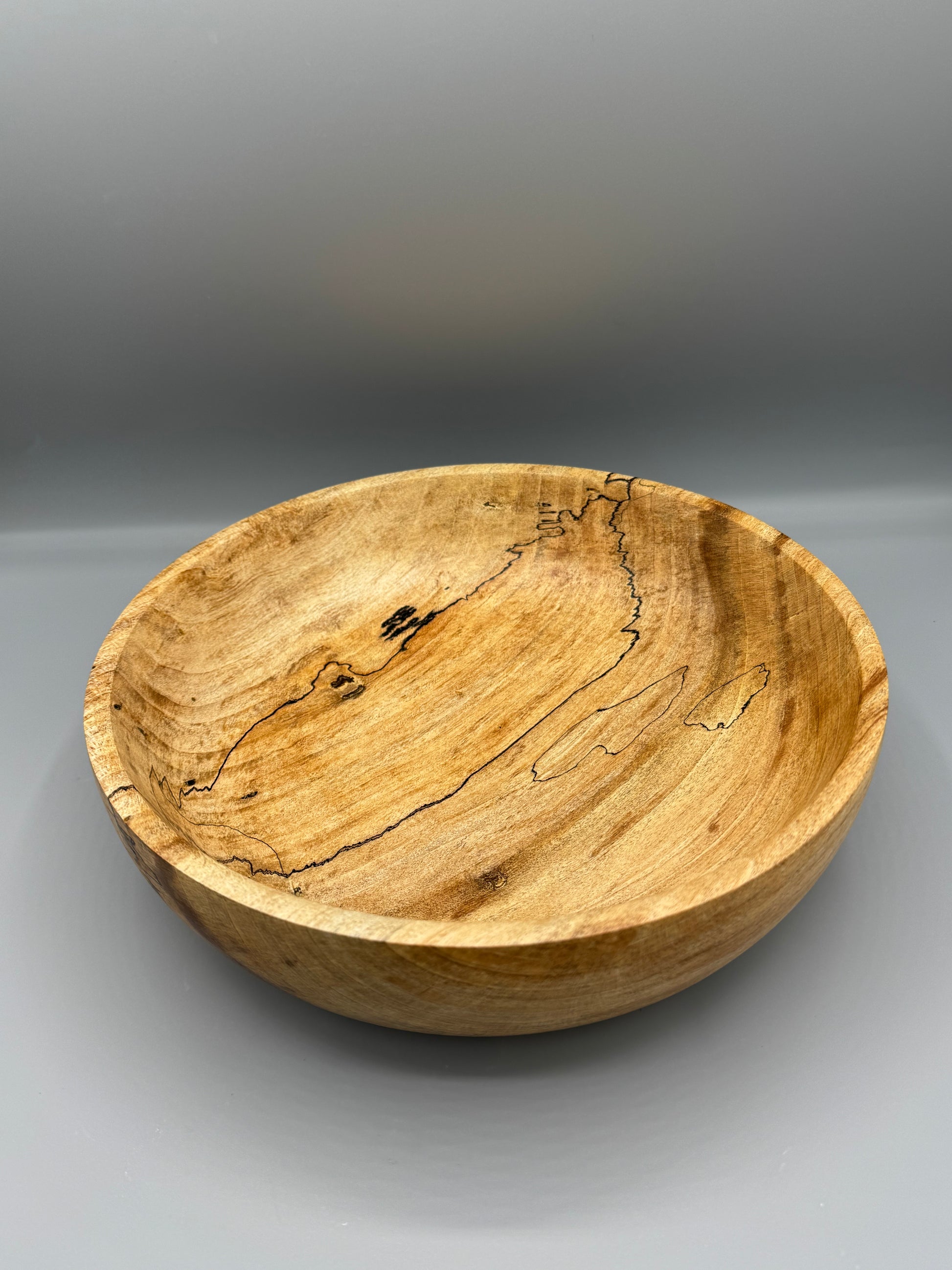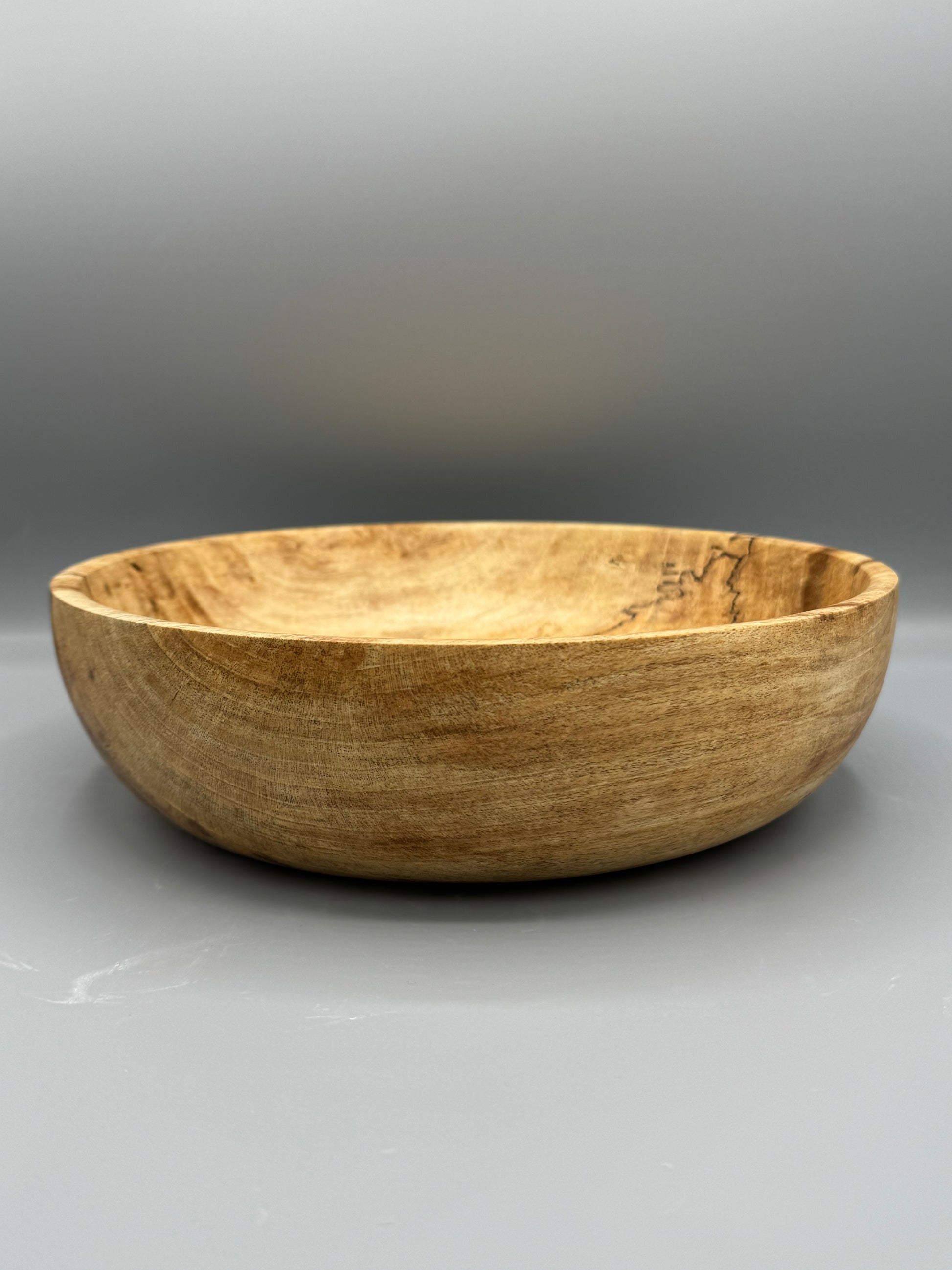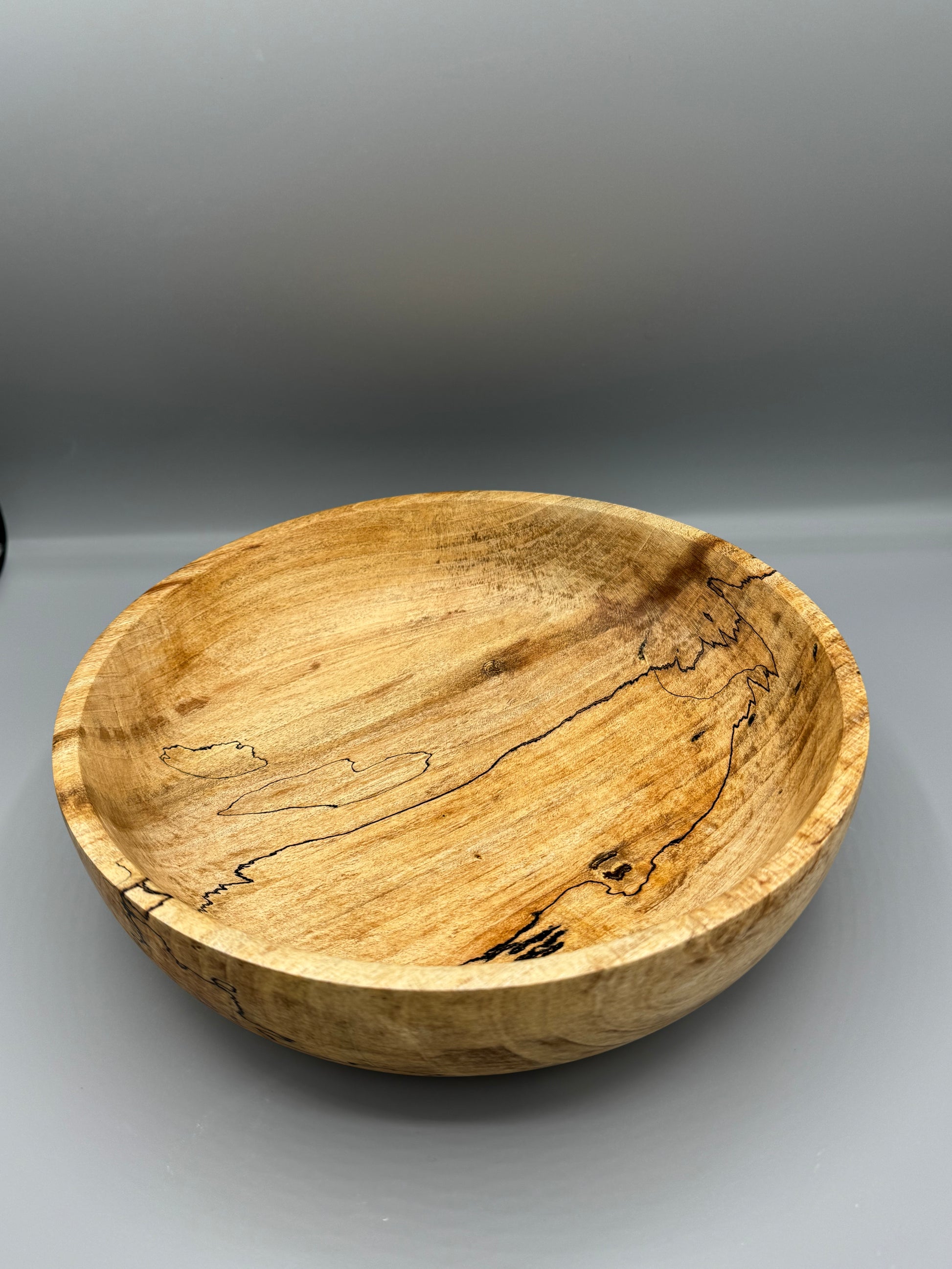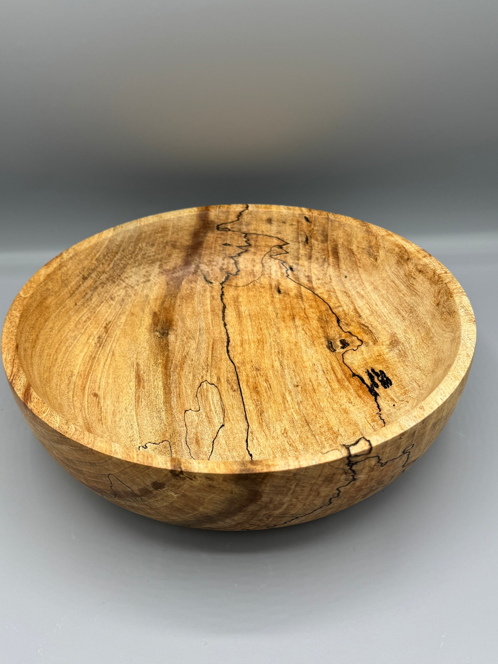 Hand-turned Spalted Maple wood bowl, 9.75 inches wide and 2.75 inches tall. Finished with linseed oil and beeswax.